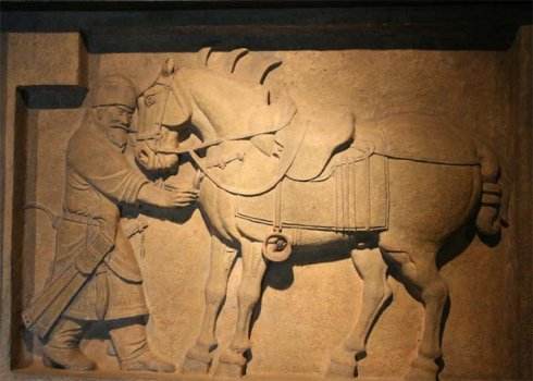 图片:昭陵六骏之飒露紫,站立拔箭者为丘行恭。原件现藏于美国费城宾夕法尼西亚大学考古学与人类学博物馆。