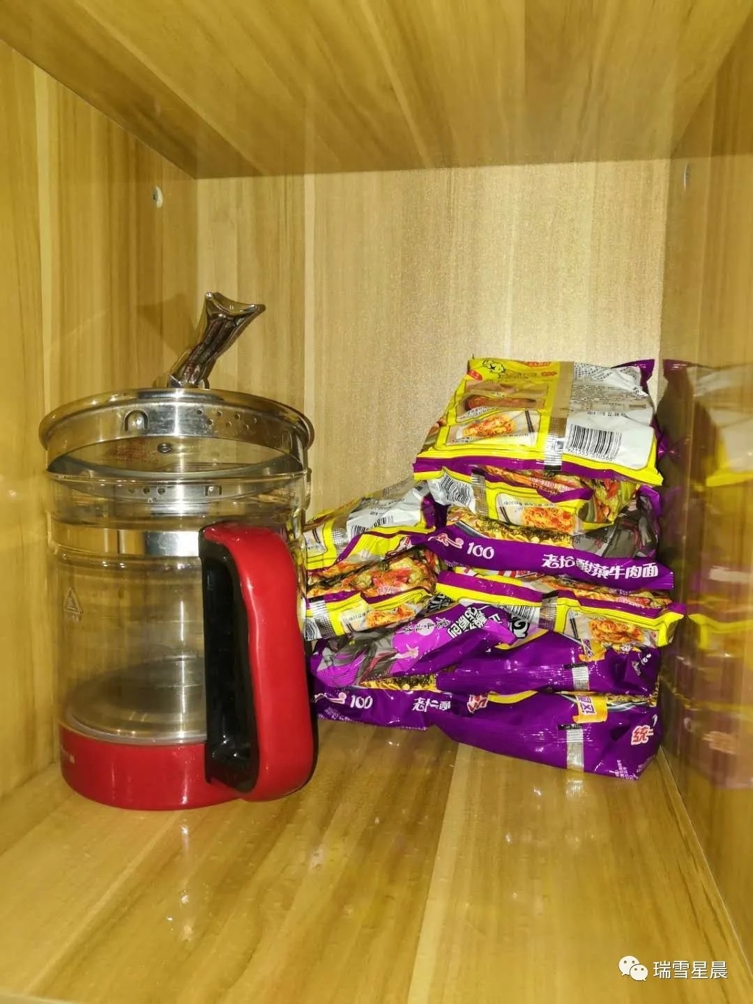 看着方便面我心情很复杂,我把自己带来的,经过了九千米高空开过光的酸菜方便面、养生壶、小米堆到了衣橱里: