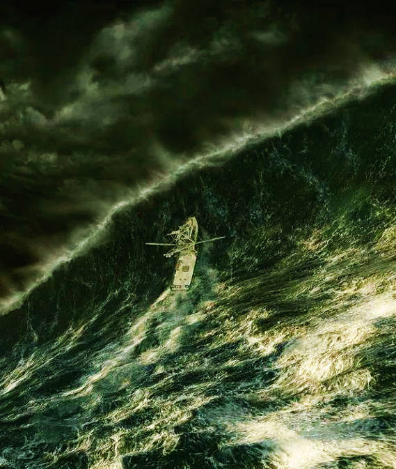 整个海洋都在响应着“胡大砍先生”的愤怒!墨绿色的海水像是开锅了一般从里往外翻涌着令人惊悸的白色泡沫!海涛的起伏夸张得犹如就要挣脱海平面去迎接西边压来的黑色天幕!
