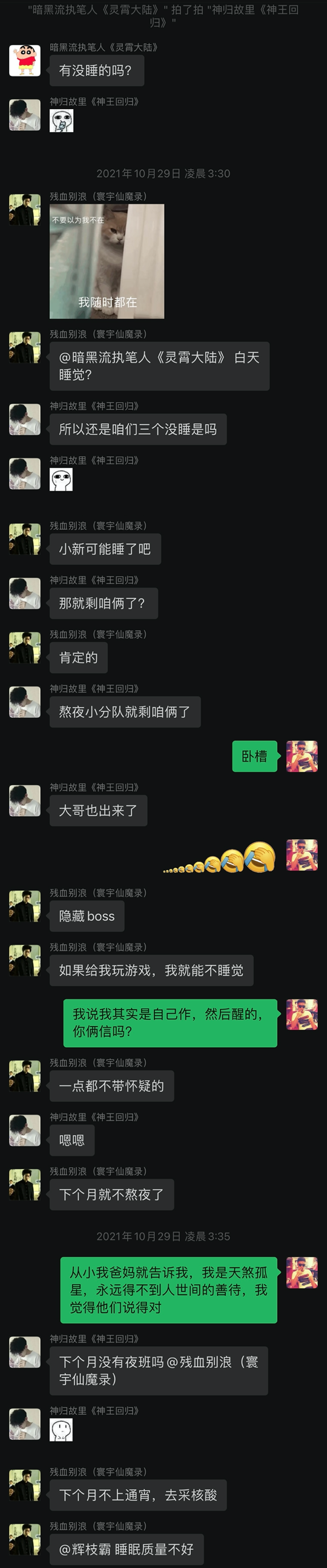 《凌霄大陆》的作者, 暗黑流执笔人一句“有没有睡的”,炸出了距离我八百公里的舔狗帮的八弟——他是一个晚上不睡,白天上课的东北精神小伙,接着,值夜班的医生“老残”随之加入了夜间“龙门阵”。